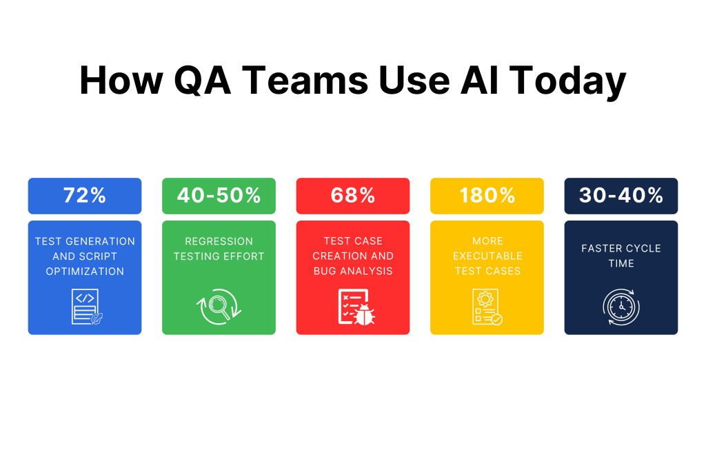 AI assists QA teams by generating test cases, triaging defects, analyzing logs, planning regressions and creating automation scaffolds. It significantly cuts defect resolution time when prompts include context and structure.