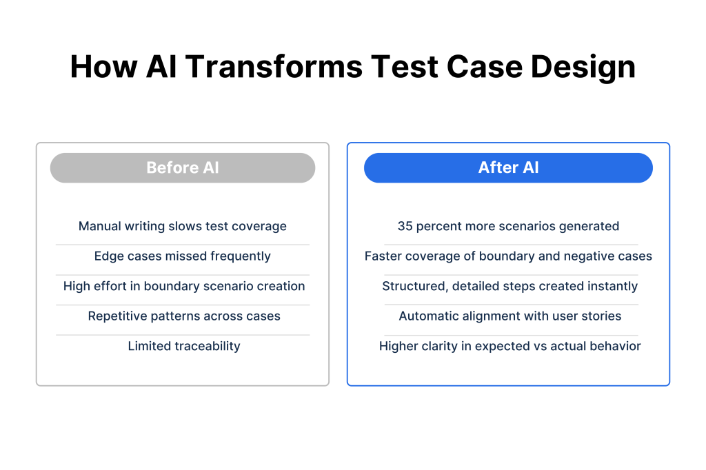 AI test cases serve as strong drafts with human review ensuring coverage gaps and risks are addressed. Detailed prompts boost reliability, with teams reporting debugging drops after workshops.