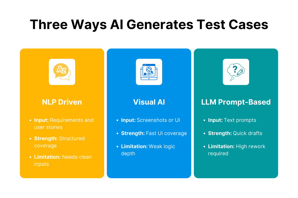AI test case generator tools employ three main methods: NLP-driven (requirements to steps), visual AI (screenshots to cases), and generative (LLM prompts for drafts).