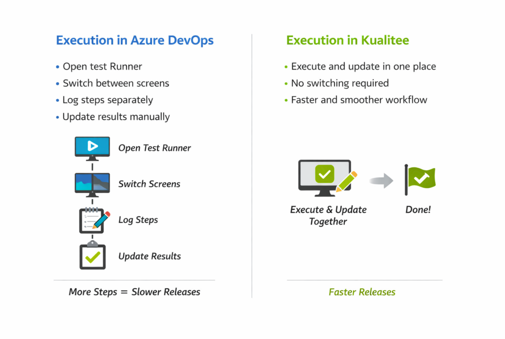 In Azure DevOps, executing manual test cases requires launching a separate Test Runner and navigating across multiple views. Testers often move between screens to mark steps, log results, and manage execution status.