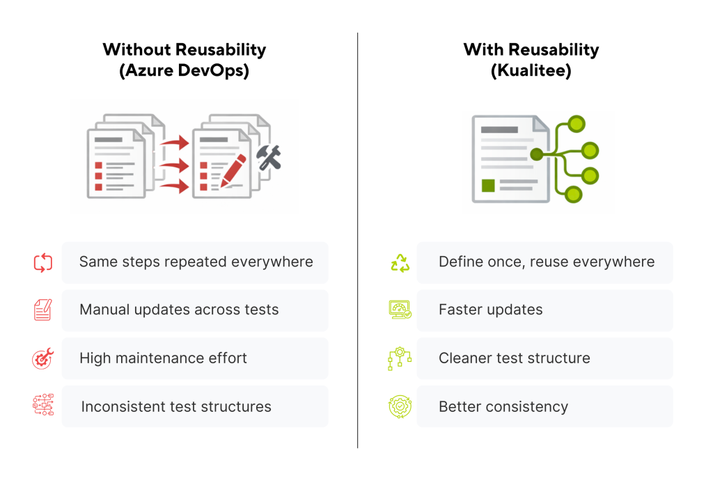 Azure DevOps does not offer built-in support for common preconditions or reusable components. As a result, teams often duplicate similar steps across multiple test cases.