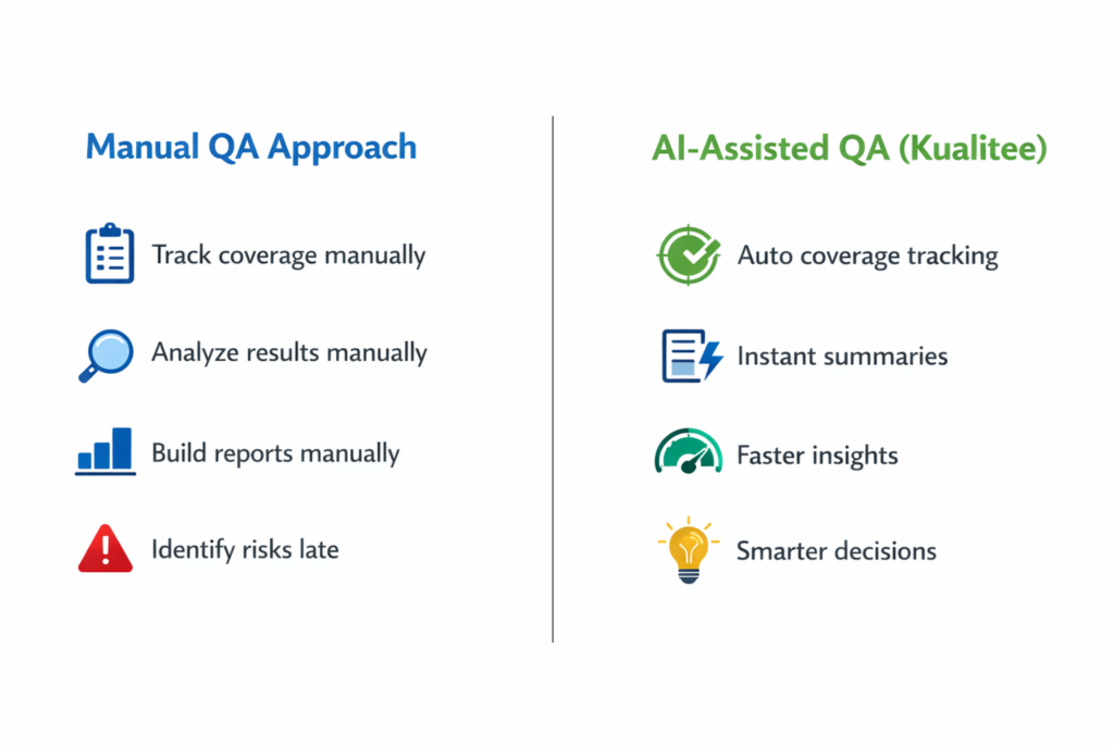 AI helps teams track coverage, identify risks, and generate insights quickly. It makes testing faster and more data-driven.
