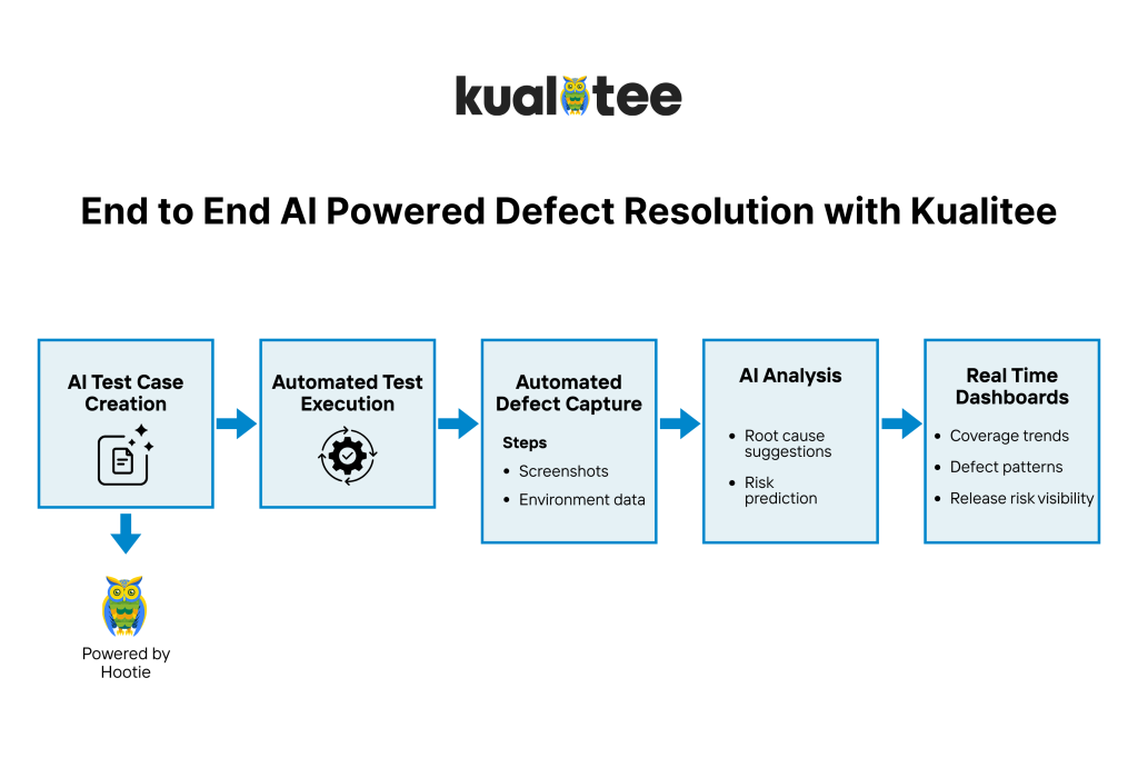 • AI Agent Hootie: Kualitee’s very own AI assistant, Hootie, can automate test case creation for QA. With it, you get up to 80% coverage and more free time to focus on complex scenarios.