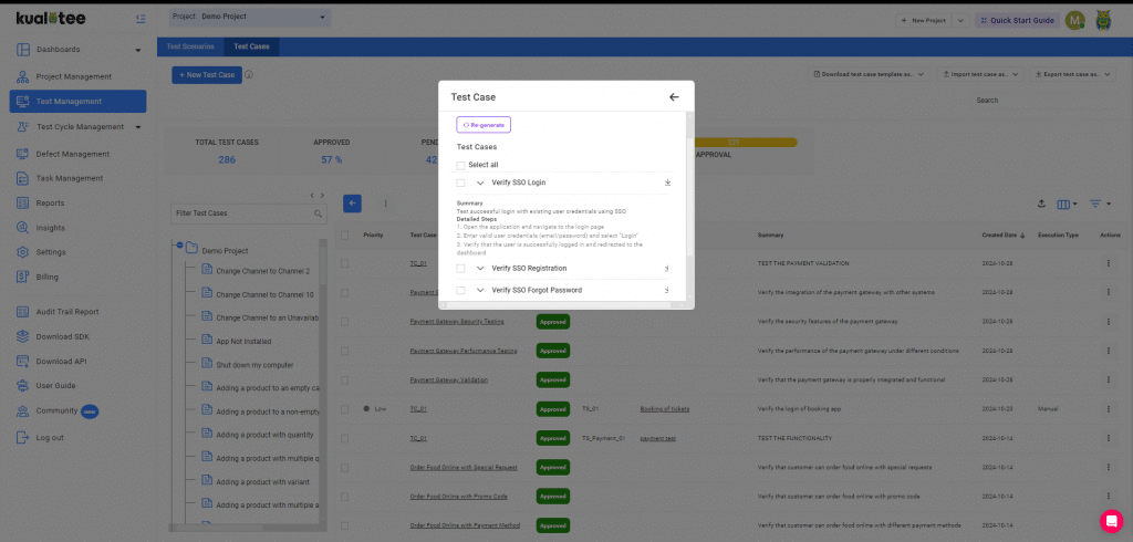 With Kualitee’s AI features, you can input your requirements and test scenarios in text, in the form of UI screenshots, or provide your business requirements document. After that, Hootie will generate detailed test cases in either Gherkin or textual form (depending on which option you choose).