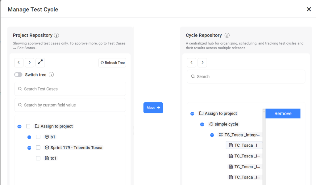 Press and hold the Ctrl key and select one or more test cases. Once selected, the Remove button will appear at the top of the Cycle Repository. Click Remove to delete the selected test case(s) from the respective cycle.
