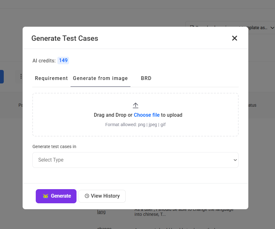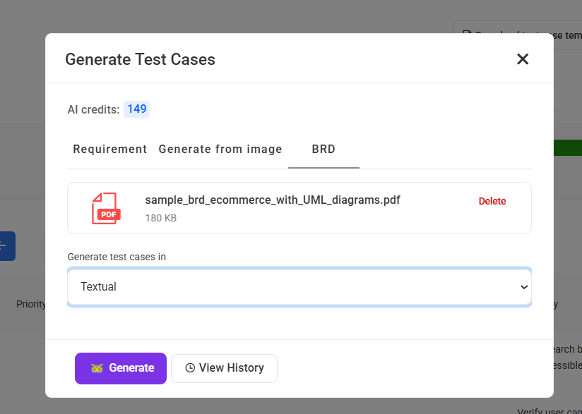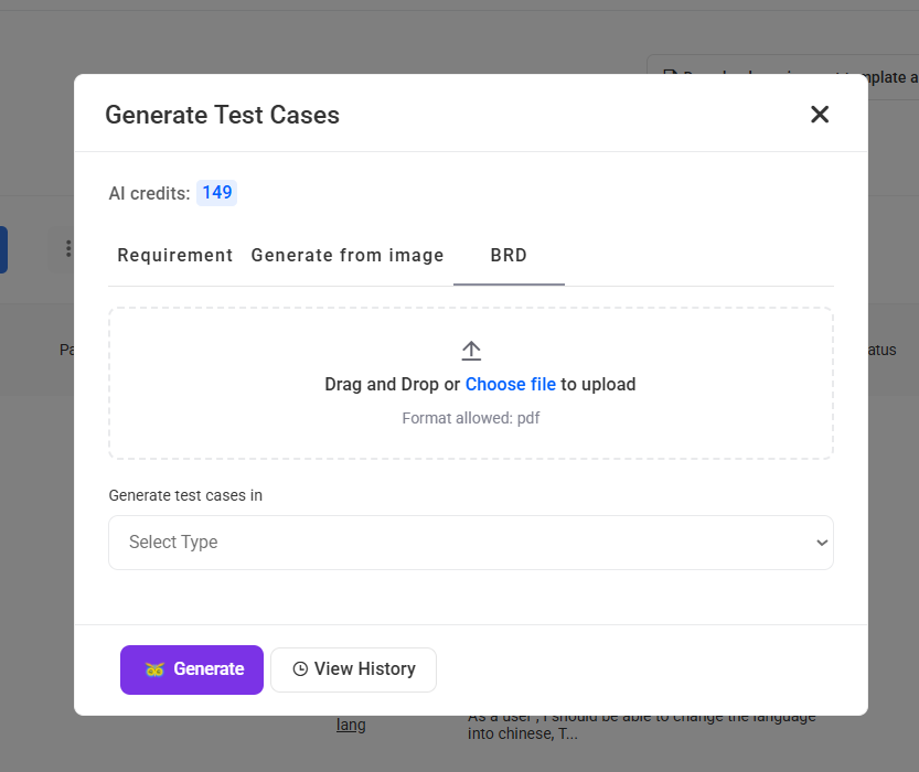 3- Upload your BRD file in the PDF format. Then, pick whether you’d like your test cases to be produced in Textual or Gherkin format using the dropdown.