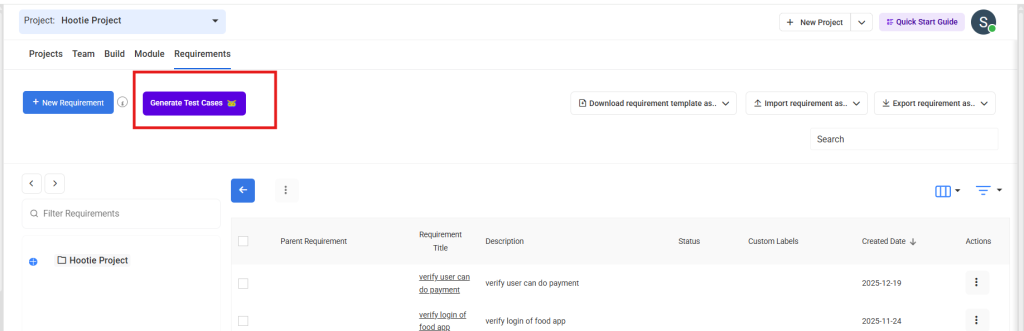1- Head to the Requirements section from the project management tab and click on Generate Test Cases.