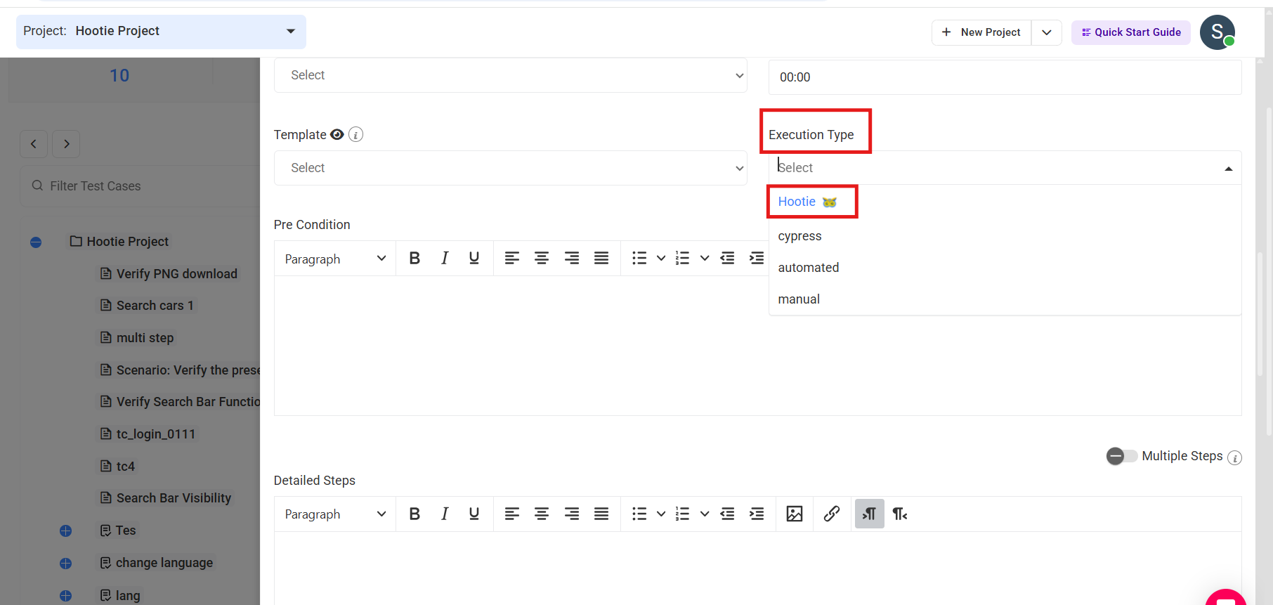 1- Navigate to the test case creation screen. Then, define the test cases with detailed steps, expected results and application credentials. You also have to select Hootie as the “Execution Type”.