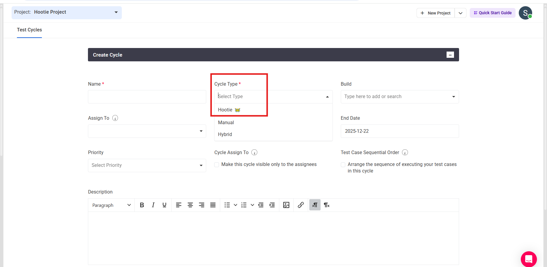 3- Now, click on Create New Cycle and select “Hootie” as the cycle type. Then, fill out all the fields. Once that’s done, add your test cases to the cycle you just created.