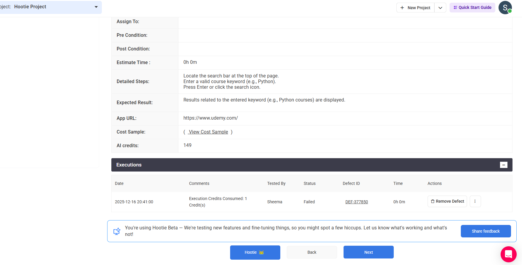 Once created, you can also execute these test cases with Hootie. It will run them, update statuses automatically and log defects when needed.