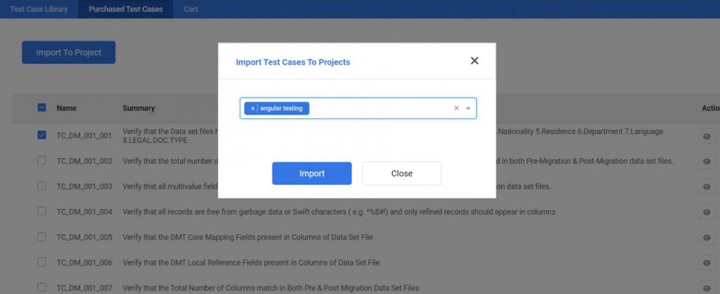 6. In the Purchased Test Cases tab, you can view the list/summaries of the test cases you have purchased and import the select test case(s) to your project.
