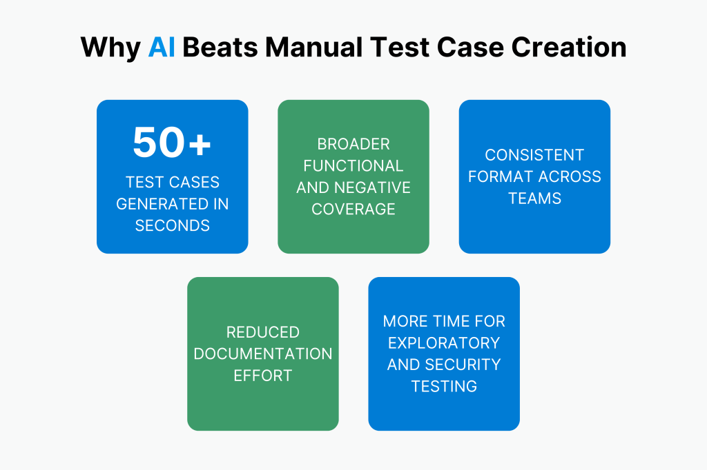 - Efficiency and Speed of Generation: AI can make more than 50 test cases in seconds. This often takes people hours to do.
